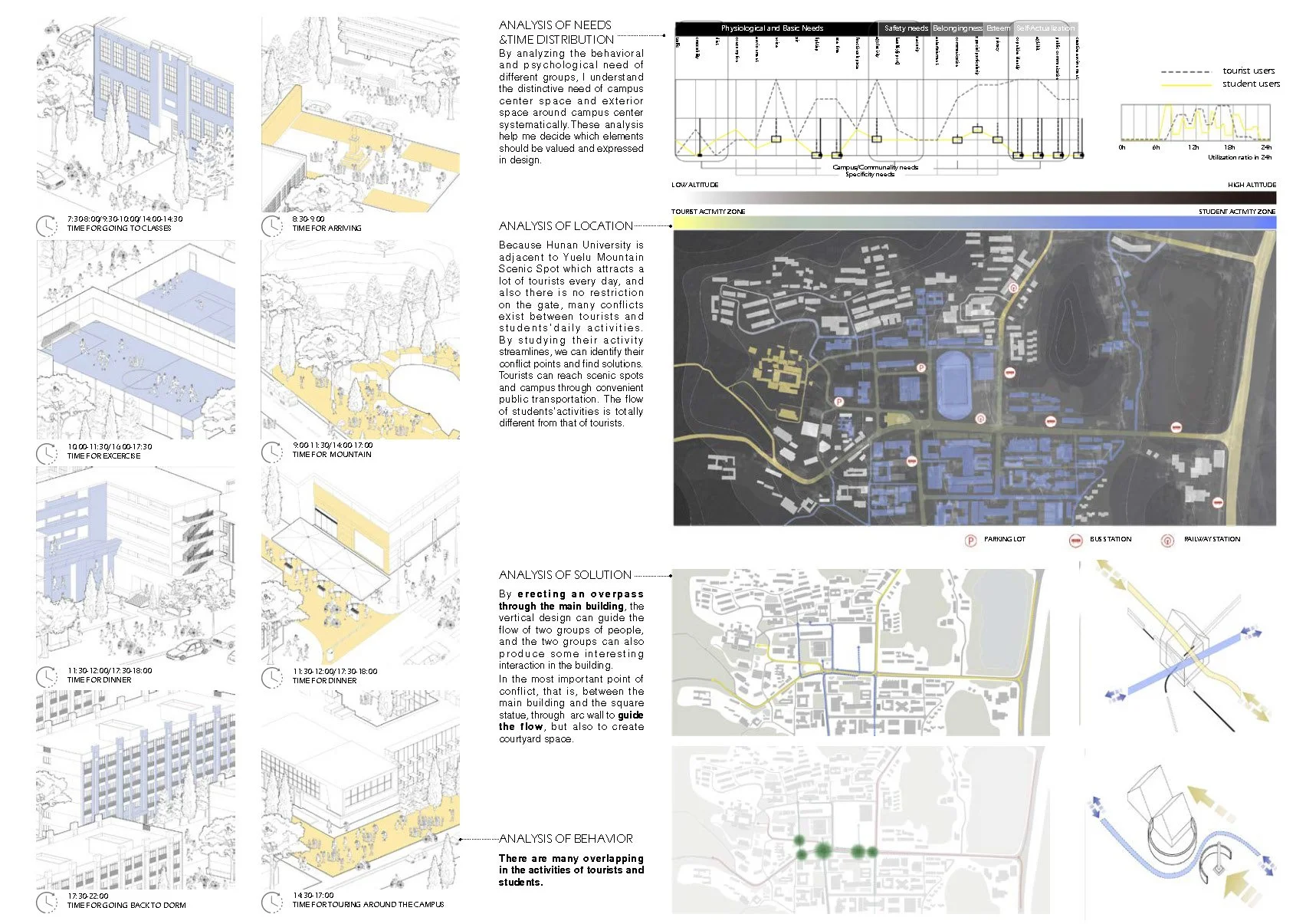 Tourists’ activities have a great impact on the university teaching area without the restrictions of the school gate, occupying the space of students' normal study and life. And because of the different direction of streamline, there will be more possibility of conflict at the intersection point. Students lack a sense of belonging in such a campus, which is also not conducive to show tourists the real campus style.